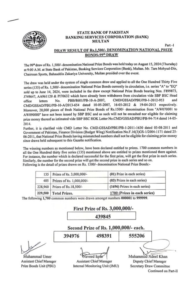 The National Prize Bonds was held on August 15, 2024 (Wednesday) at 9:00 A.M at the State Bank of Pakistan, SBP BSC (Bank), Multan.
