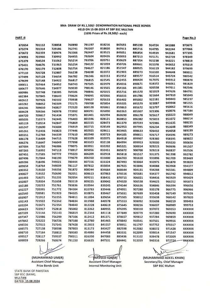 99th Draw Result of Rs. 1500/- Denomination of National Prize Bonds ( پرائز بانڈ لسٹ 1500 2024 )