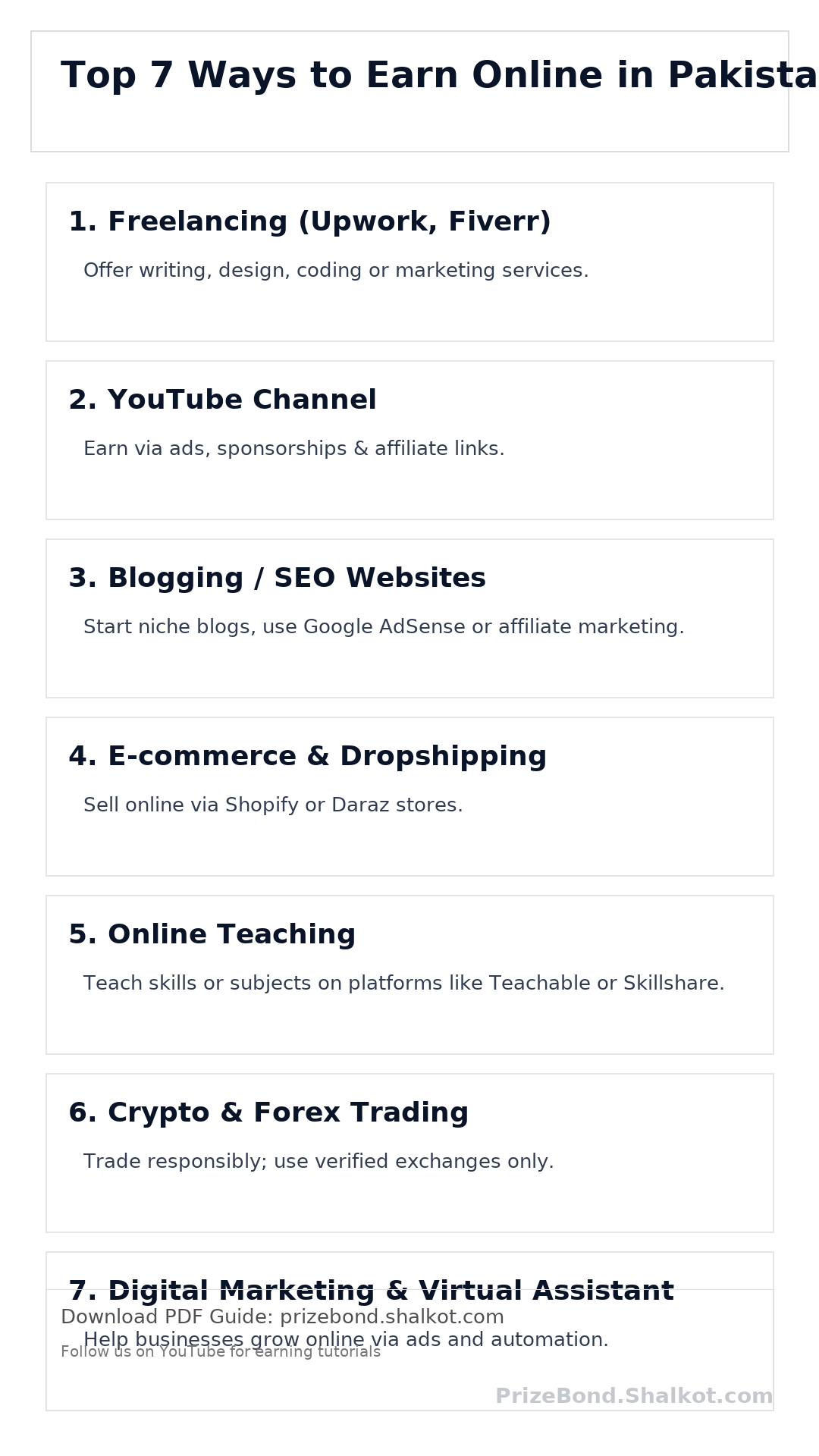 اوپر سات طریقے ہیں جو 2025 میں پاکستان میں عام اور قابل عمل ہیں — ہر ایک کے لیے اختیاری راستہ اور ابتدائی اقدامات نیچے تفصیل سے دیے گئے ہیں۔